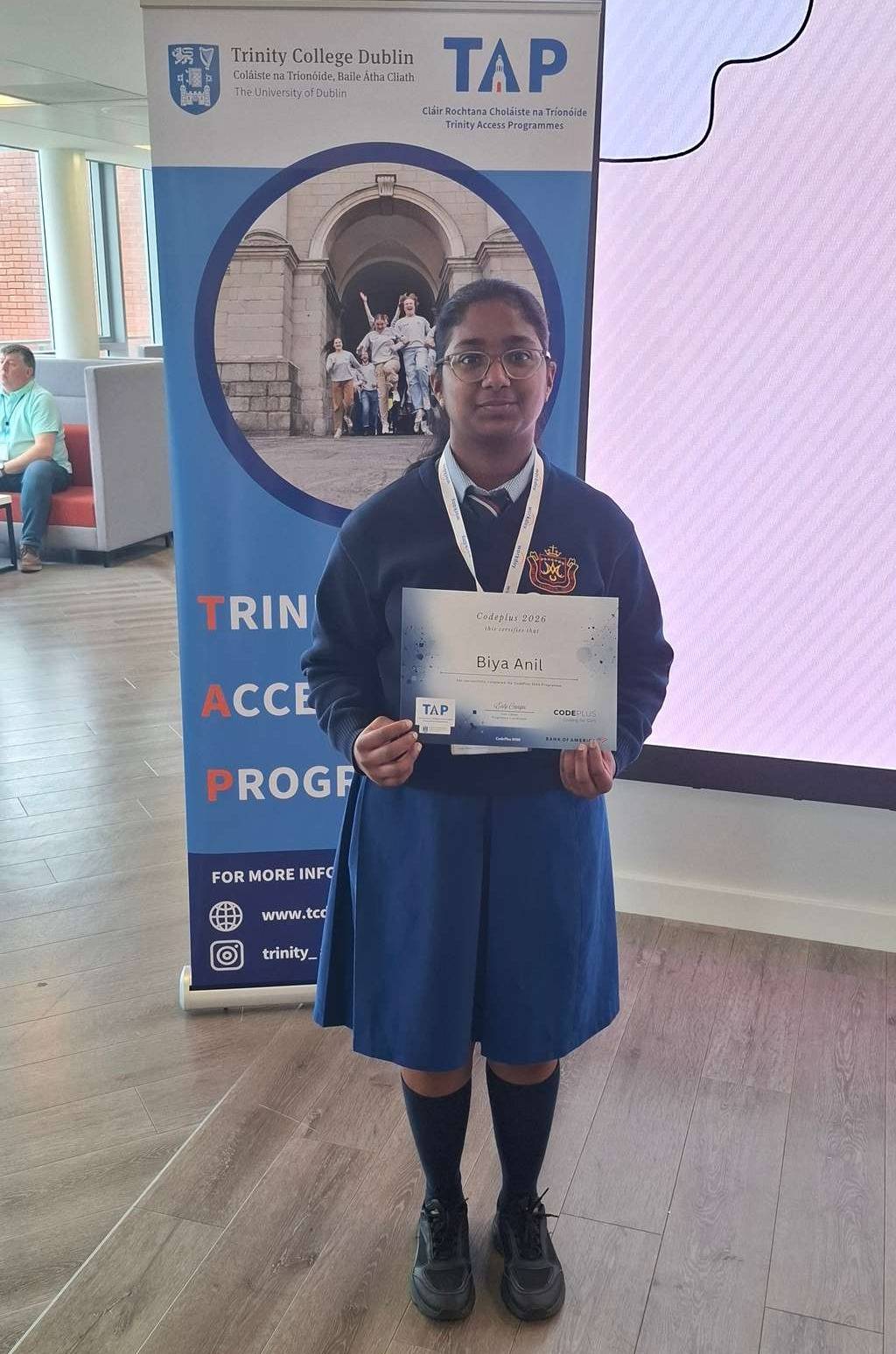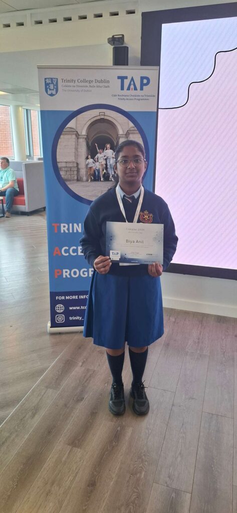 Well done to Biya in Transition Year, who graduated from the TAP CodePlus programme last week. This programme is a mix of team-based, hands-on coding projects, problem solving and computational thinking activities, and an opportunity to meet with women either studying or working in the field. It also supports students in gaining a better insight into college life generally, becoming more confident in meeting new students, and gaining some skills in public speaking and communication.